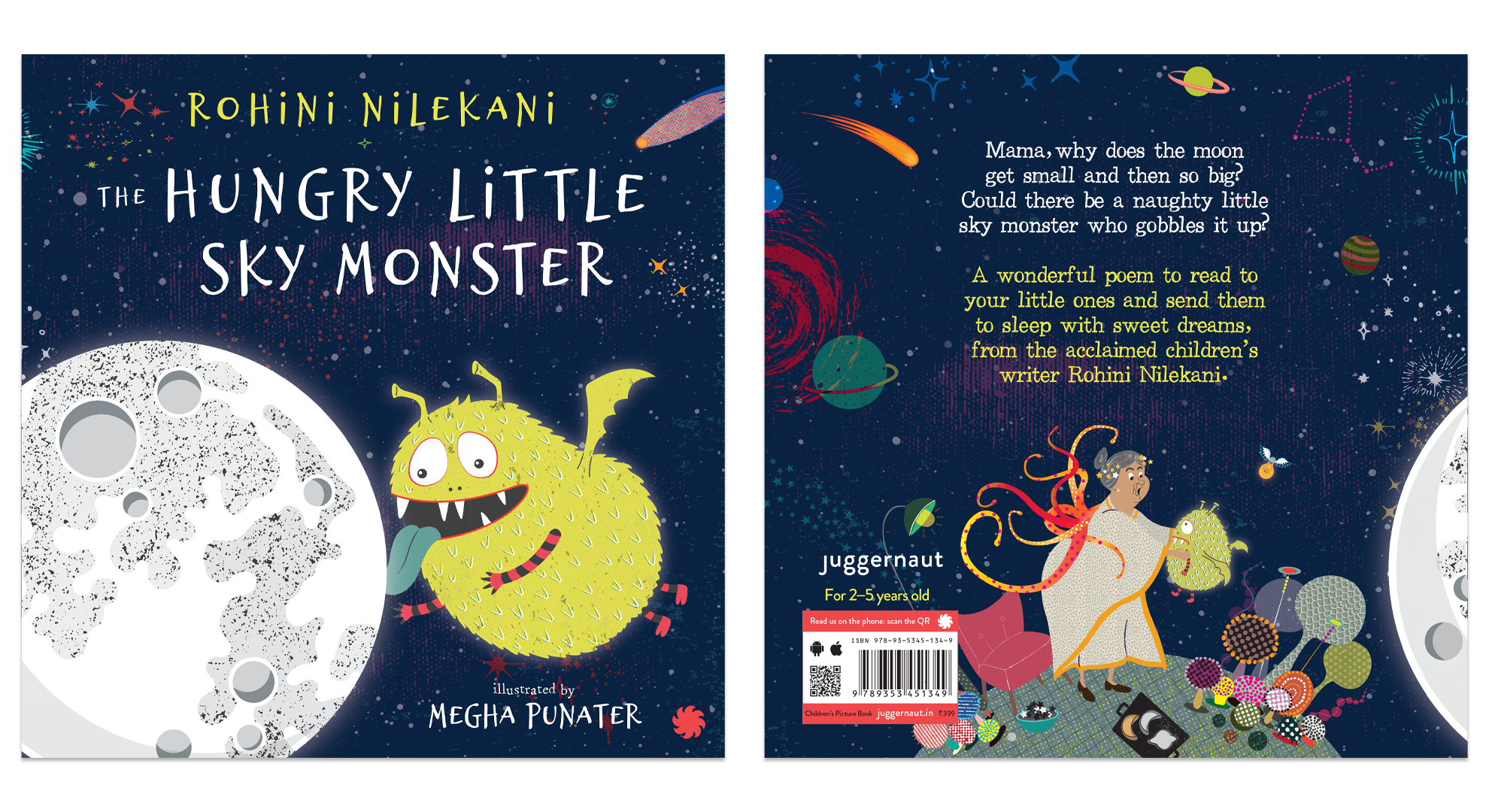Mama, why does the moon get small and then so big? Could there be a naughty little sky monster that gobbles it up?A wonderful poem to read to your little ones and send them to sleep with sweet dreams, from the acclaimed children’s writer Rohini Nilekani.